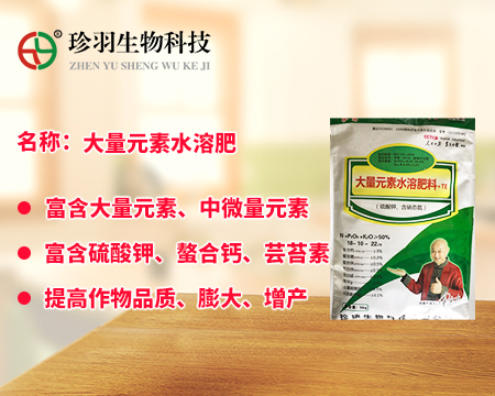 大量元素水溶肥料為經(jīng)水溶解或稀釋?zhuān)糜诠喔仁┓省⑷~面施肥、無(wú)土栽培、浸種蘸根等用途的液體或固體產(chǎn)品,可以葉面施肥、浸種蘸根、灌溉施肥,灌溉包括噴灌、滴灌等方式進(jìn)行灌溉時(shí)施肥,既節(jié)約用水,又節(jié)約施肥,而且還植物吸收快,大量元素水溶肥是一種可以完全溶于水的多元復(fù)合肥料,它能迅速地溶解于水中,更容易被作物吸收,而且其吸收利用率相對(duì)較高,我們看一下珍羽生物的大量水溶肥。